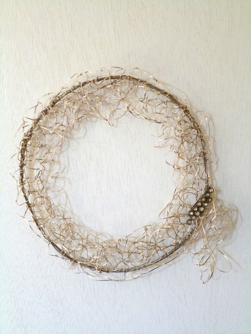 Wreath made of hand-knotted vintage silver gimp thread, 2 vintage brooches, thin copper wire, and electrical copper lashing wire for the frame. The size is: 9.5″ x 9.5″. Awaiting acceptance into the Arsenal Gallery’s 32nd Annual Wreath Interpretations show.